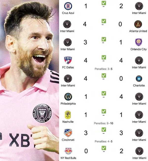 梅西加盟之后:9场不败、斩获北美联盟杯冠军、闯入美国公开杯决赛、联赛摆脱垫底位置;