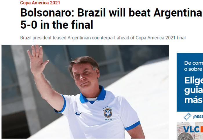 最近南美几个国家的领袖进行了一次视频会议,博索内罗也谈到了接下来的美洲杯决赛,他说道:“巴西和阿根廷只有一种竞争,那就是几天后的美洲杯决赛。巴西将会5-0击败阿根廷。”