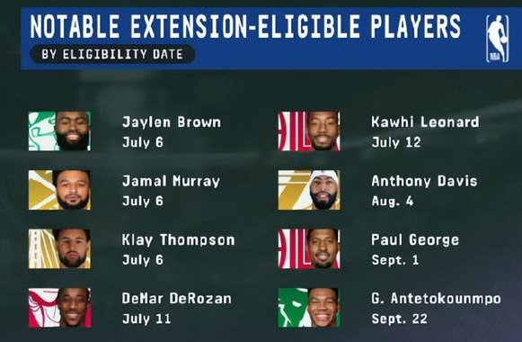 除了浓眉、小卡和乔治之外,绿军球星杰伦-布朗今夏有望和球队提前续签最高5年3.04亿美元的历史最大合同,勇士球星克莱-汤普森、掘金球星穆雷以及德罗赞和字母哥都有望提前续约;在今夏自由球员交易市场开启后,短短2天就达成十多份亿元合同,新赛季开打前,联盟有望再达成多份亿元续约合同。