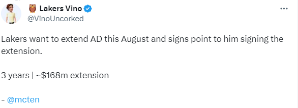 据ESPN名记Dave McMenamin报道,湖人预计将在训练营开始前与浓眉提前续约,该记者在节目中表示:佩林卡认为上赛季浓眉克服脚伤,这是湖人2020年夺冠的重要原因,他希望浓眉继续留在湖人队,从目前的情况来看,预计他们会达成某种续约协议,相信浓眉将带着一份续约合同参加训练营。