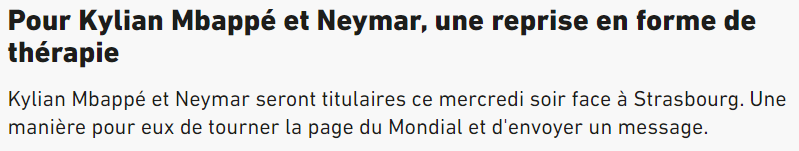 《队报》表示,巴黎主帅加尔蒂埃对于队内一些国脚们在结束世界杯之旅后就尽快返回球队的做法很满意,其中姆巴佩更是在踢完世界杯决赛后只休息了两天便回归球队,并且姆巴佩、内马尔等人的状态也都不错。