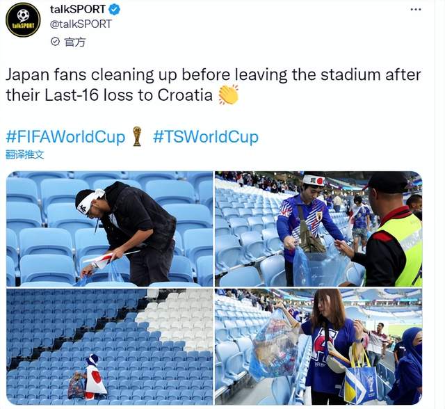 虽然输球,但日本球迷赛后风度依然,他们还在做着每一场比赛结束后做的事情,捡起看台上的垃圾。这一行为,再度得到了多家媒体的报道,称日本球迷在输球的结果下,依然不忘捡起垃圾,这样的行为非常高尚。事实上,日本球迷捡垃圾的行为此前已经得到过国际足联的官方赞扬。