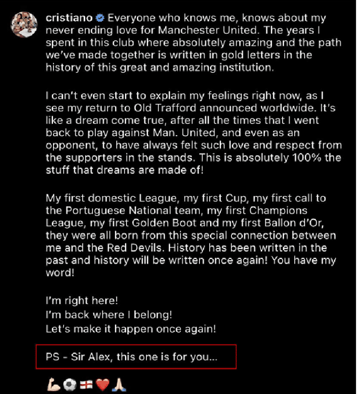 C罗发文解释回归曼联原因:弗格森爵士,这全是为了你!