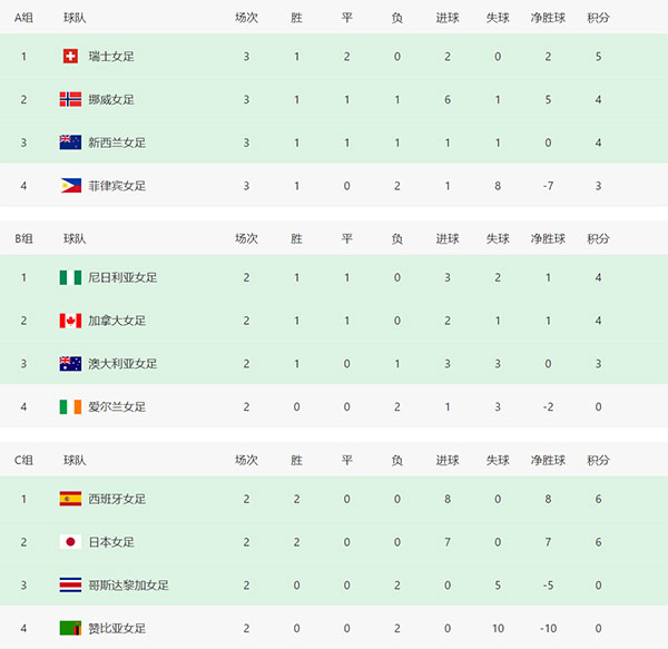 A组大结局,瑞士和新西兰战成0-0平,再加上挪威6球横扫菲律宾,这样东道主新西兰在首战赢球的情况下出局,瑞士和挪威携手晋级。B组的竞争还是很激烈的,尼日利亚和加拿大队4分,澳大利亚队输球之后只有3分,爱尔兰则是提前出局。C组的格局明朗,西班牙和日本队都是两连胜提前晋级,哥斯达黎加和赞比亚两连败淘汰,西班牙和日本队争夺小组第一,西班牙不败就将拿下榜首。