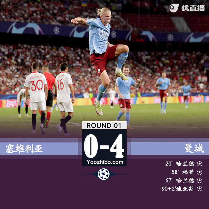 24直播网讯北京时间9月7日3:00,欧冠小组赛首回合塞维利亚主场迎战曼城的比赛,上半场德布劳内助攻哈兰德破门,下半场福登破门,哈兰德完成梅开二度,迪亚斯补时建功,最终,曼城客场4-0塞维利亚。