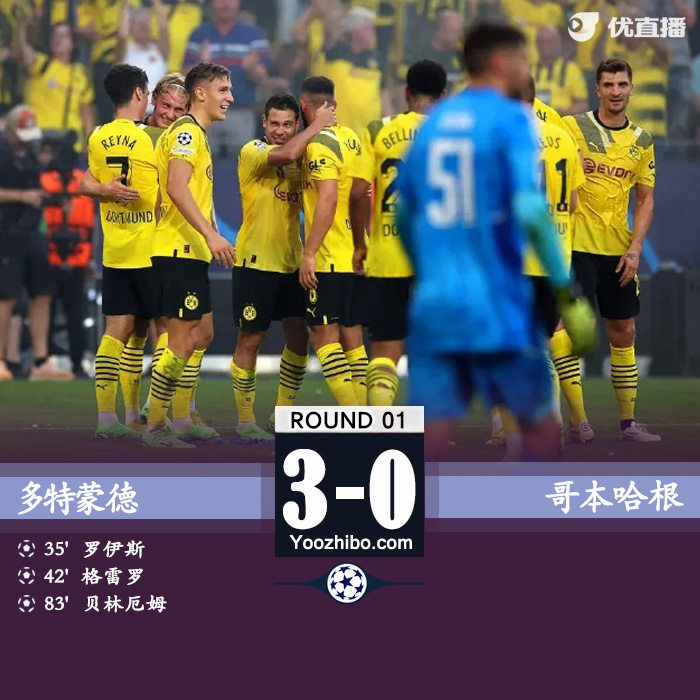 24直播网讯北京时间9月7日0时45分,欧冠小组赛第1轮展开角逐,多特蒙德坐镇主场迎战哥本哈根。上半场,罗伊斯破僵,格雷罗低射扩大比分。半场多特2-0领先。下半场,贝林厄姆再下一城。最终多特主场3-0取得欧冠开门红。
