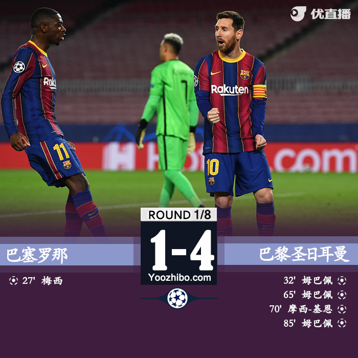 24直播网2月17日讯 北京时间2月17日凌晨4点整,2020-21赛季欧冠1/8决赛首回合在诺坎普球场展开角逐,巴塞罗那坐镇主场迎战巴黎圣日耳曼。上半场梅西点射打破僵局,姆巴佩扳平比分,下半场姆巴佩上演帽子戏法,基恩破门。最终巴塞罗那主场1-4遭巴黎圣日耳曼逆转,双方将于3月11日移师巴黎王子公园球场进行次回合较量。