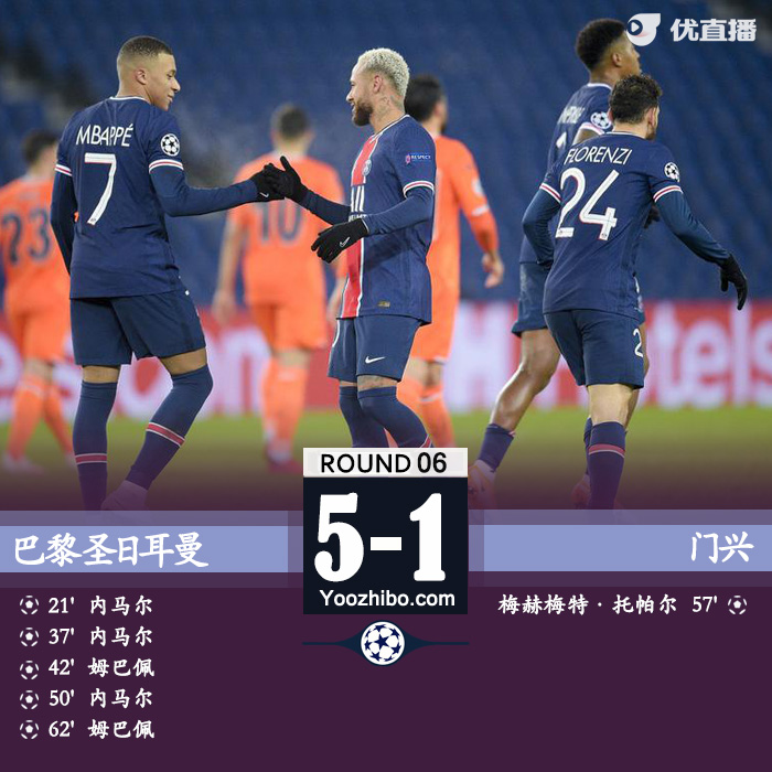 24直播网讯:北京时间12月10日凌晨1:55,2020-2021赛季欧冠小组赛H组第6轮,巴黎圣日耳曼与伊斯坦布尔的比赛恢复进行。上半时比赛内马尔梅开二度后造点,姆巴佩点射一蹴而就扩大优势。下半时比赛内马尔世界波破门成功戴帽,托帕尔为客队追回一球,迪马利亚随后助攻姆巴佩再下一城锦上添花。最终,巴黎圣日耳曼5-1击败伊斯坦布尔头名出线。