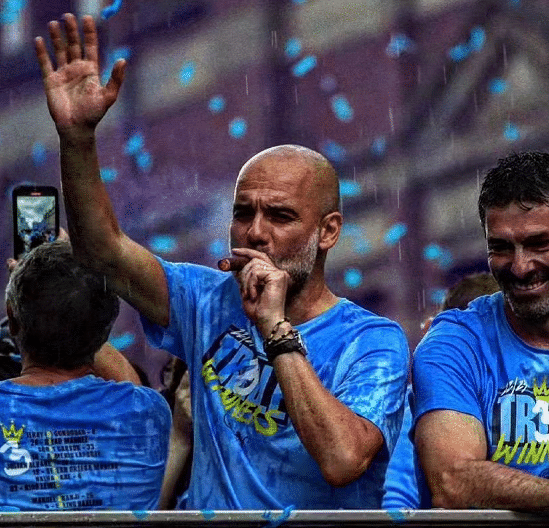 瓜迪奥拉穿着冠军T恤出场的时候点燃了所有人的激情,他也不断挥舞着手臂,现场合唱瓜迪奥拉之歌,瓜帅高举奖杯。在游行期间,瓜迪奥拉的胜利雪茄安排上了,对于这样顶级的主帅来说,他的压力也是巨大的,如今斩获三冠王,终于可以好好放松下了。