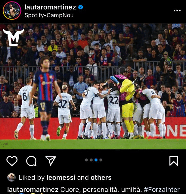 本轮欧冠国米客场战平巴塞罗那,劳塔罗进球,赛后发了一个在诺坎普庆祝的状态,阿根廷队友梅西点赞。