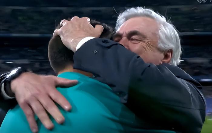 终场哨声吹响的一刻,皇马替补席上的球员纷纷冲进场内,和队友们一同欢庆胜利。本泽马高举双臂仰天长啸!伯纳乌主场欢声雷动,此时俨然已经成为欢乐的海洋。主帅安切洛蒂也难掩激动,涨红了脸和助手激情拥抱疑似飙泪。安切洛蒂第5次率队晋级欧冠决赛,成为教练史上第一人。
