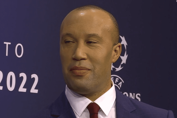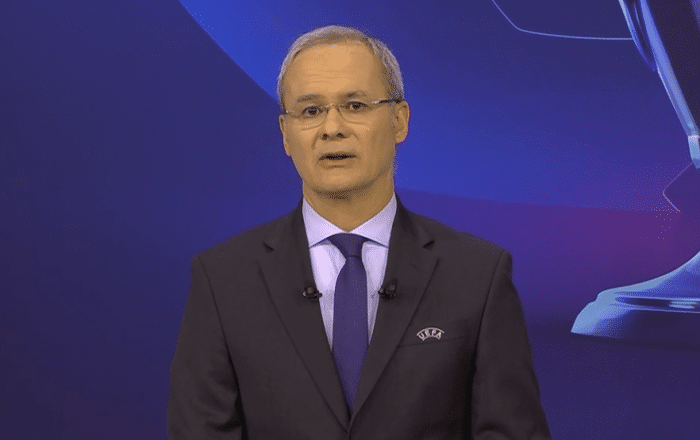 曼联名宿西尔维斯特担任抽签嘉宾,抽签仪式开始后,主持人先来到了场上,主持人先是介绍了规则,欧冠决赛将在巴黎法兰西大球场举行,随后现场播放了各支球队的短片,镜头给到了各支球队的代表,西尔维斯特登场。