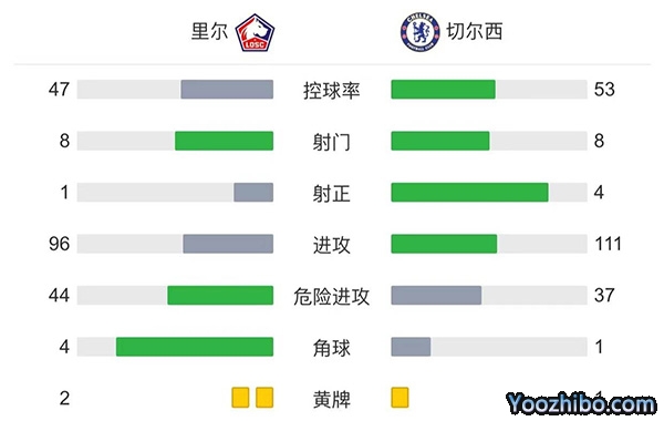 全场比赛结束,最终切尔西本场2-1击败里尔,总比分4-1晋级八强。