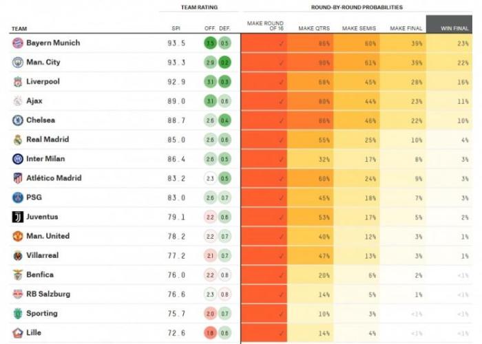 24直播网12月14日讯 昨晚欧冠16强抽签结果出炉,大数据网站Fivethirtyeight计算了各队的夺冠概率。