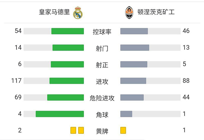 下半场补时三分钟,第90分钟矿工球员苏达科夫左路禁区外冷射被库尔图瓦扑出。随后邓蒂尼奥对裁判判罚不满吃到黄牌,最终,皇马2-1矿工。