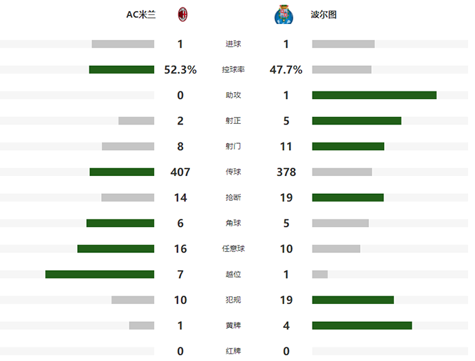 第60分钟,本纳塞尔任意球击中人墙,吉鲁第一下补射被门将扑出,卡卢卢禁区左侧小角度再次补射造成姆本巴乌龙,AC米兰1-1波尔图。