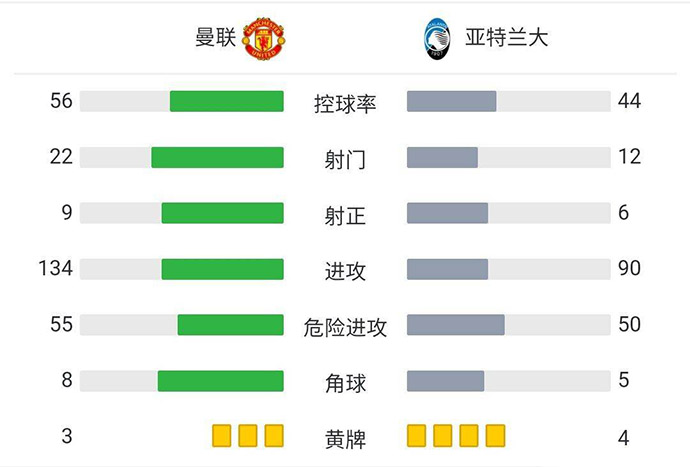 最终全场比赛结束,曼联3-2战胜亚特兰大。
