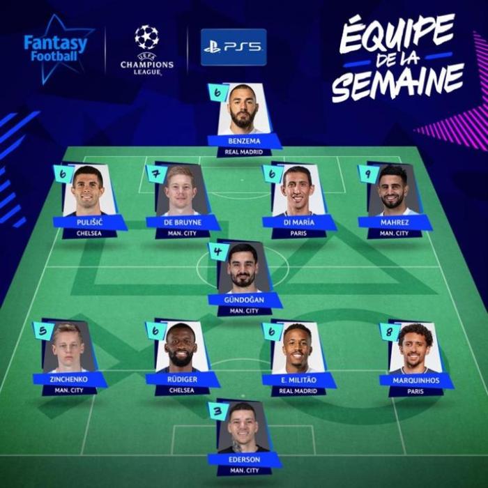 中场:马赫雷斯(曼城)9分、迪马利亚(PSG)6分、京多安(曼城)4分、德布劳内(曼城)7分、普利西奇(切尔西)6分