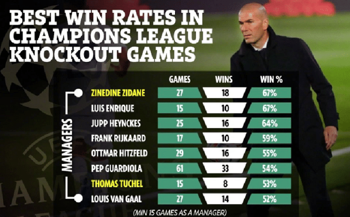 主帅欧冠淘汰赛胜率榜:齐祖榜首,爵爷穆帅未上榜!