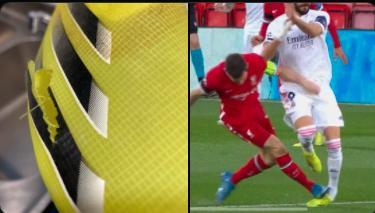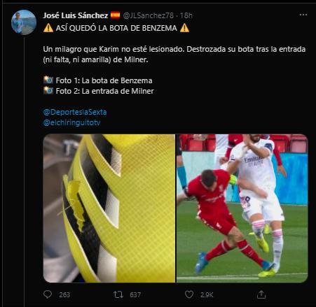记者Jose Luis Sanchez展示了本泽马的鞋子并配文道:“这是本泽马的球鞋,本泽马没有受伤真是奇迹。本泽马的球鞋被踩破了,然而裁判没有判犯规。”