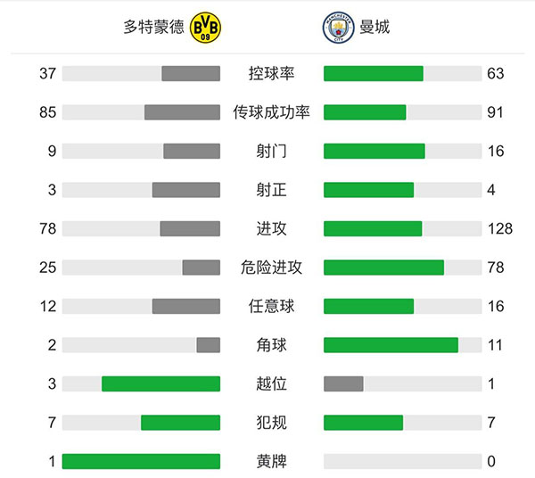 全场比赛结束,曼城客场2-1战胜多特蒙德。