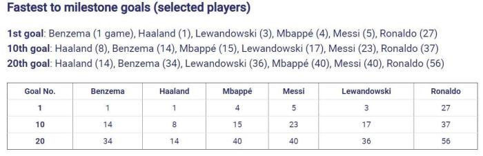 此外,欧足联还比较了目前几位当红球员打进第1、第10和第20粒欧冠进球时所用的场次,哈兰德和姆巴佩两位年轻球员依然领先梅西和C罗。