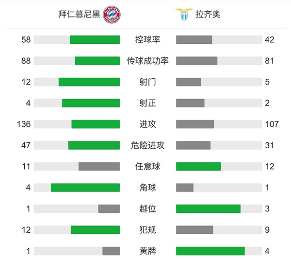 全场比赛结束,拜仁慕尼黑2-1拉齐奥,总比分拜仁6-2拉齐奥晋级欧冠八强。