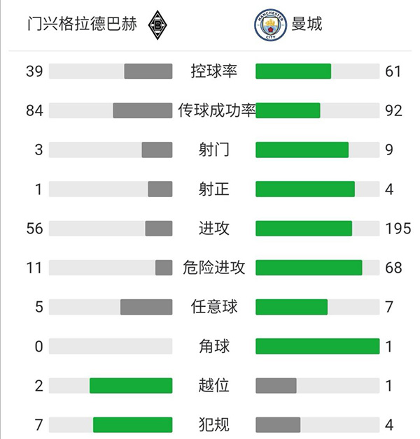 29分钟曼城取得领先,门兴后场勉强出球被坎塞洛抢断,后者45度送出传中B席后点头球破门,1-0,曼城客场取得领先!