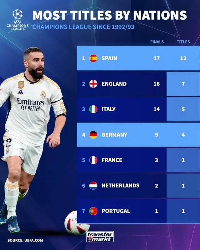 欧冠改制后各国夺冠次数(依德转):西班牙12次,英格兰7次