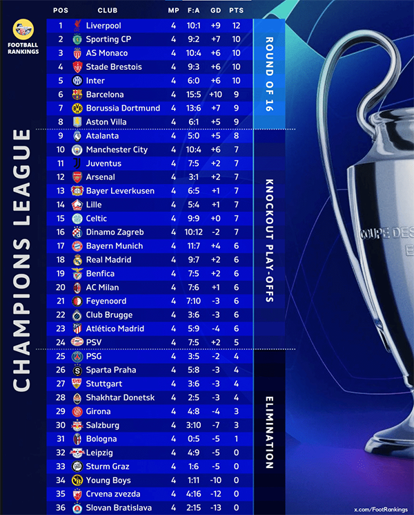 此外,拜仁、皇马、AC米兰这三大老牌豪门4轮后也都只是分别排名在第17、第18和第19位,有些出乎意料。当然最让人大跌眼镜的莫过于大巴黎。本轮被马竞绝杀后,大巴黎已经跌至第25,处于淘汰区。在摩纳哥、布雷斯特、里尔等其他法甲球队表现出彩情况下,作为联赛霸主,大巴黎本赛季在欧冠确实有些拉垮了。