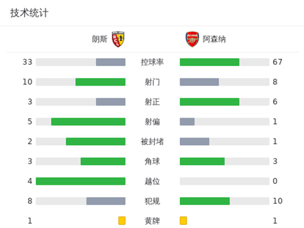 第14分钟,朗斯后场出球失误被萨卡抢断,萨卡直接将球分给热苏斯,后者晃开防守球员后低射远角,桑巴奋力扑救但无能为力,阿森纳1-0朗斯。