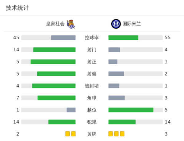 第4分钟,巴斯托尼后场带球被抢断,布莱斯-门德斯直接面对索默推射得手,VAR介入,进球有效,皇家社会1-0国际米兰。