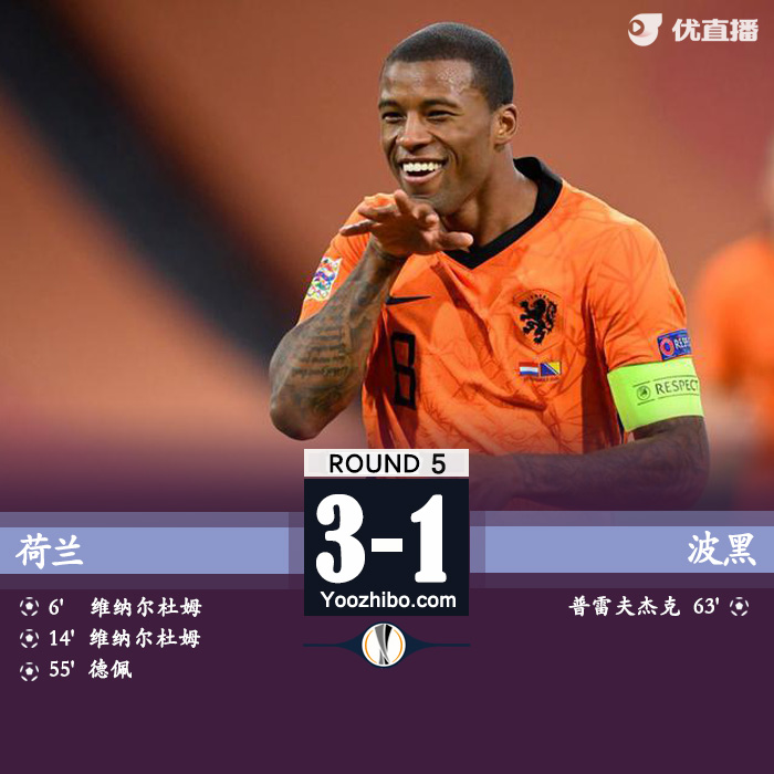 24直播网讯:北京时间11月16日1时(荷兰当地时间15日18时),欧洲国家联赛A1组第5轮先赛1场,荷兰主场3比1击败波黑,取得近6场首胜,也是弗兰克-德波尔上任以来首胜。队长维纳尔杜姆开场15分钟梅开二度,德佩扩大比分。邓弗里斯两次助攻。