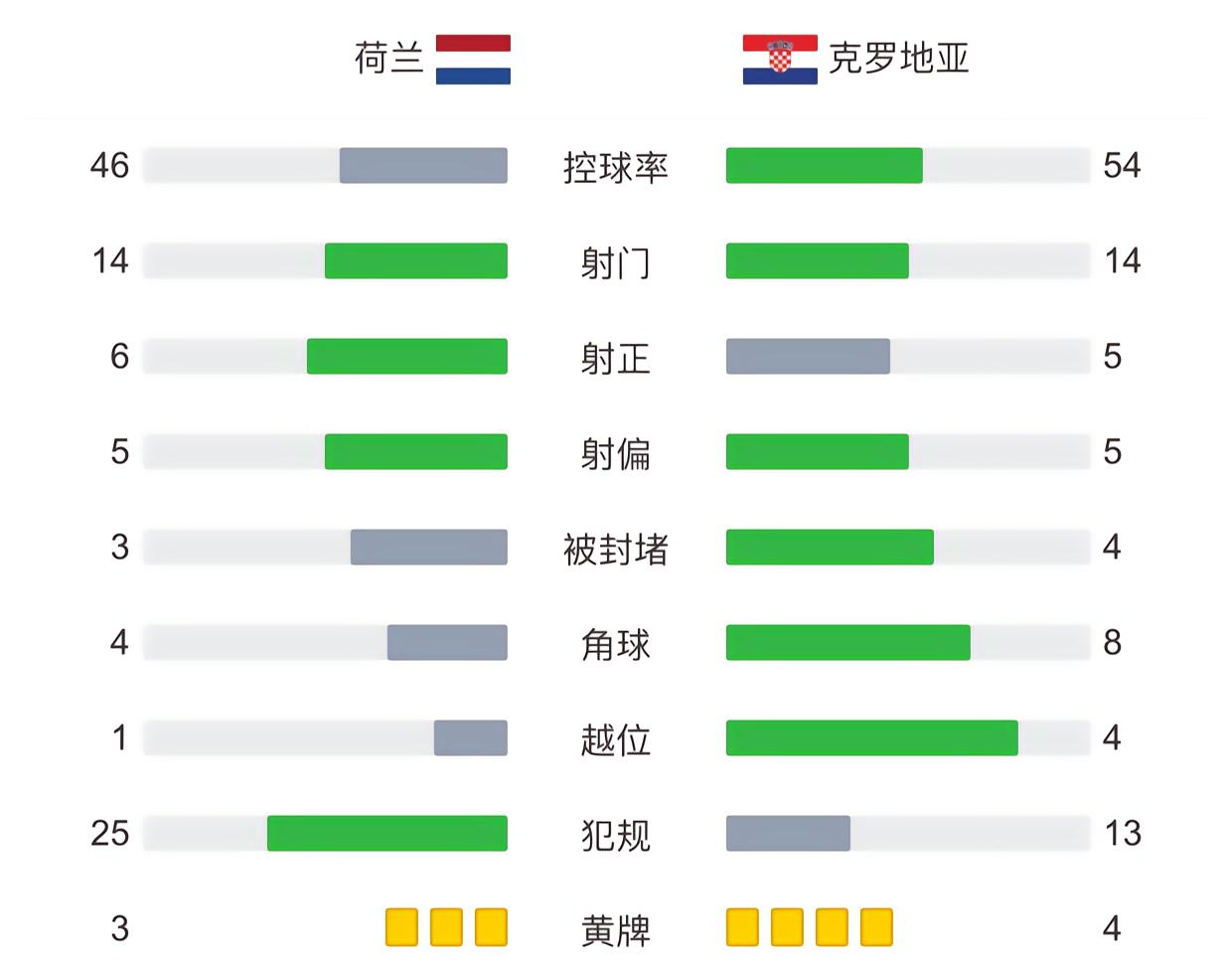 荷兰首发:1-比尔罗、22-邓弗里斯(85'10-诺阿-朗)、12-海特勒伊达、4-范戴克、5-阿克(105'16-马拉西亚)、6-魏费尔(75'8-威纳尔杜姆)、20-库普梅纳斯、21-弗朗基-德容、18-马伦(75'7-贝尔温)、9-加克波(105'15-德容恩)、11-哈维-西蒙斯(46'19-韦格霍斯特)