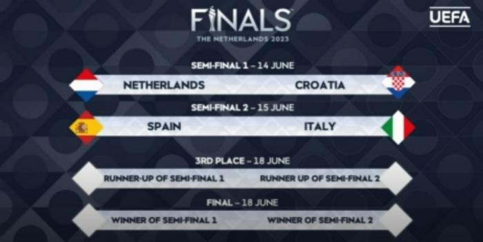 具体对阵安排(北京时间):克罗地亚vs荷兰(2023年6月15日凌晨2:45)、西班牙vs意大利(2023年6月16日凌晨2:45)