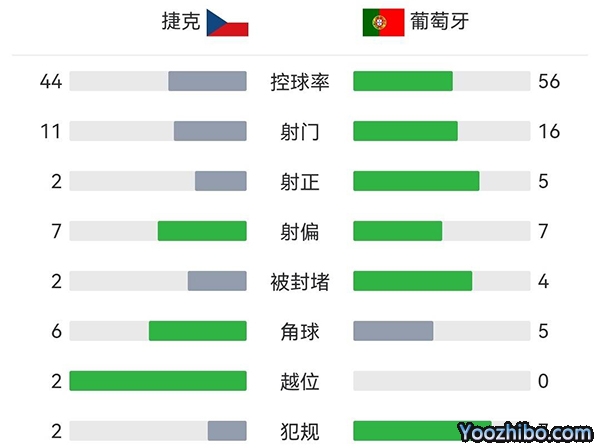 第46分钟,葡萄牙扩大比分!鲁伊前场左侧横扫门前,B费后插上小禁区里轻松推射破门。捷克0-2葡萄牙。