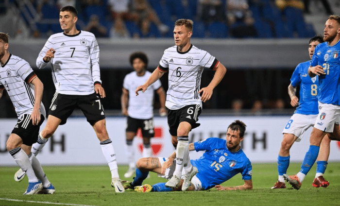 德国媒体“图片报”预测了德国队和意大利队此役的首发11人,认为诺伊尔、克洛斯特曼、聚勒、吕迪格、亨里希斯、基米希、京多安、萨内、穆勒、霍夫曼、哈弗茨11人会组成德国队首发阵容。意大利的首发11人为多纳鲁马、卡拉布里亚、加蒂、巴斯托尼、斯皮纳佐拉、巴雷拉、克里斯坦特、佩莱格里尼、波利塔诺、拉斯帕多里、尼奥托。