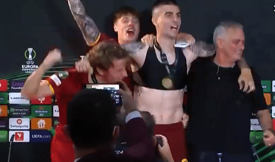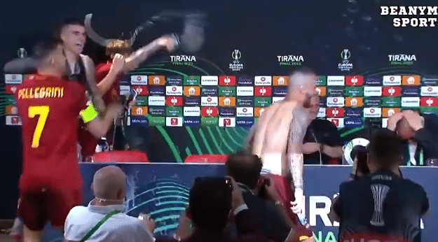 罗马的球员们“大闹”新闻发布会,看到穆里尼奥接受采访,以佩莱格里尼领衔的罗马球员们拿着香槟突袭穆帅的新闻发布会,大家一起又唱又跳,场面热闹无比。全队庆祝之后,穆里尼奥在球员们的簇拥下离开了新闻发布会。