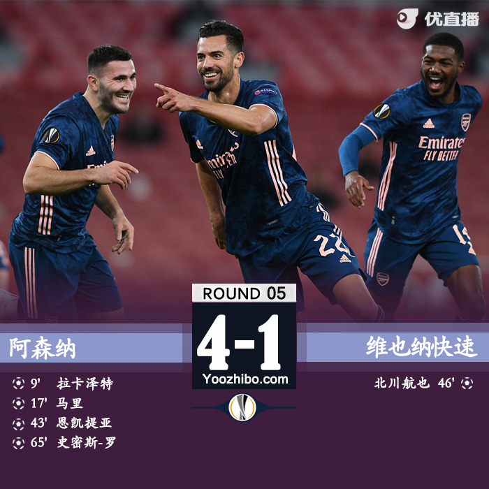 24直播网讯:北京时间12月4日04:00(英国当地时间3日20:00),2020/21赛季欧联B组第5比赛日一场焦点战在酋长球场展开争夺,阿森纳主场4比1大胜维也纳快速,拉卡泽特、马里、恩凯蒂亚和洛维先后进球,北川航也扳回一城。阿森纳5战全胜锁定小组头名。