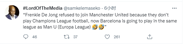 SamkeleMaseko在推特上表示:“德容拒绝曼联是因为他们没有欧冠踢,现在巴塞罗那也要去踢欧联了(笑哭))。”
