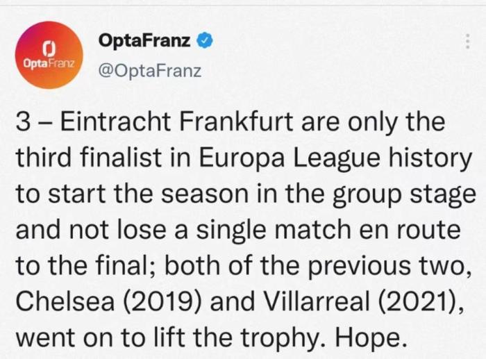 在小组赛中,法兰克福以3胜3平的成绩晋级淘汰赛,此后接连淘汰贝蒂斯、巴萨和西汉姆联,一路闯进决赛。这也是继2019年的切尔西、2021年的比利亚雷亚尔之后,第三支以不败战绩晋级欧联杯决赛的球队。