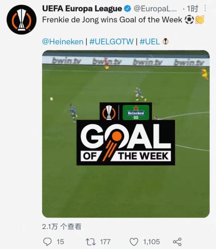 今天凌晨,在巴萨对阵那不勒斯的比赛中,弗兰基-德容在上半场打入一脚世界波。这个进球被官方评为欧联本周最佳进球。