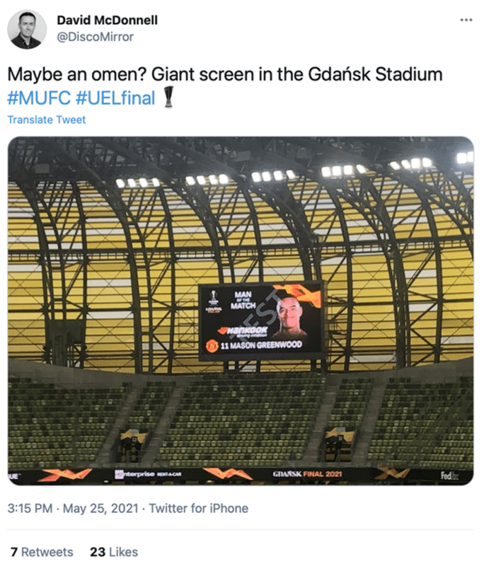 有趣的是,周二欧联杯决赛场地格但斯克球场进行设备预演时,为了测试大屏幕功能是否正常,预演打出了单场最佳球员,而他们选择的恰是曼联11号格林伍德!为了避免误会,大屏幕上也显示了明显的「TEST」(测试)字样。