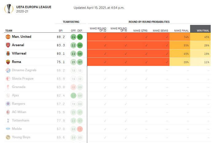 来源:24直播网04-16 16:3324直播网4月16日讯 欧联杯四强出炉了,曼联、罗马、比利亚雷亚尔和阿森纳进入了欧联杯四强,而其中曼联将要对阵罗马,比利亚雷亚尔要对阵阿森纳,首回合的比赛在当地时间4月29日举行,次回合的比赛在当地时间5月6日举行(北京时间都要晚一天)。而其中,曼联和比利亚雷亚尔都是先主后客。而大数据网站“538”也更新了本赛季欧联杯夺冠的几率,其中曼联是最大的热门。