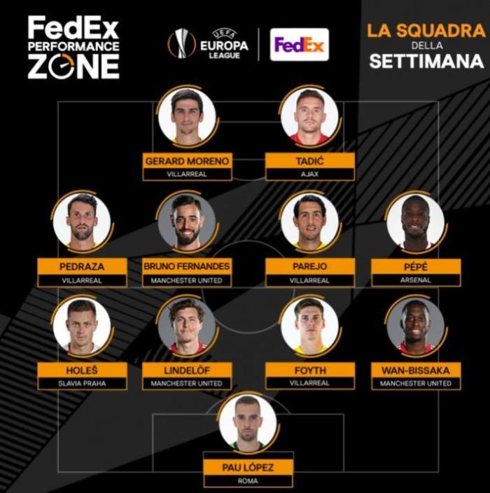 中场:佩德拉萨(比利亚雷亚尔),布鲁诺-费尔南德斯(曼联),帕雷霍(比利亚雷亚尔),尼古拉-佩佩(阿森纳)