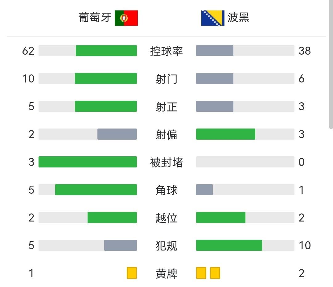 第43分钟,C罗背身做球,B费送出直塞,B席单刀球轻巧挑射得手,葡萄牙1-0波黑!