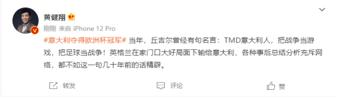 黄健翔写道:“当年,丘吉尔曾经有句名言:TMD意大利人,把战争当游戏,把足球当战争!英格兰在家门口大好局面下输给意大利,各种事后总结分析充斥网络,都不如这一句几十年前的话精辟。”