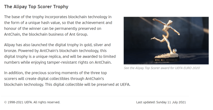 6月10日,欧足联官方发布了2020欧洲杯支付宝得分王奖杯,奖杯分为金银铜三座,分别用于嘉奖赛事进球前三位的球员,这同时也是欧洲杯60年历史上首座区块链奖杯。