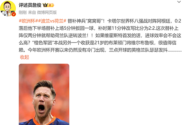 来源:24直播网06-17 11:1724直播网讯 一场荡气回肠的逆转,世界排名第七的荷兰队险些遭遇冷门,在先丢一球的情况下,橙衣军团以2-1逆转击败波兰,迎来开门红,韦霍斯特的替补建功,第83分钟的进球,帮助荷兰队取胜,赢得有惊无险。