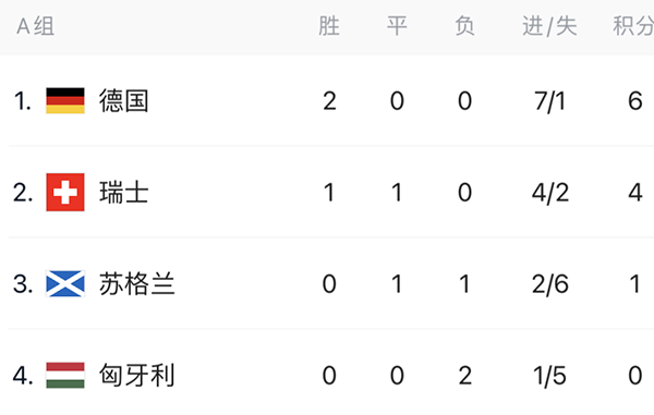2轮战罢,德国队2连胜积6分,净胜球为6个,位居小组头名,瑞士队1胜1平同样不败积4分,净胜球为2,暂列小组第2;苏格兰1平1负积1分净胜球为-4,位居小组第3位,而匈牙利则是2连败积0分,净胜球同样为-4,暂时垫底。最后1轮,德国将与瑞士展开强强对话。而匈牙利则要与苏格兰死磕。